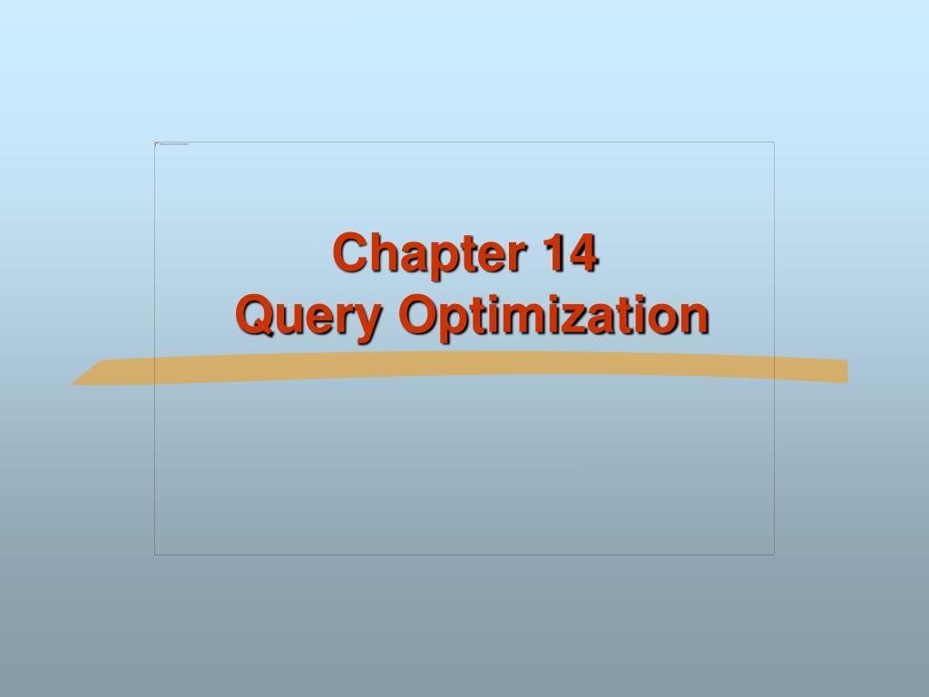 Chapter 14 Query Optimization. Chapter 14: Query Optimization. Introduction Statistical (Catalog) Information for Cost Estimation Estimation of Statistics Cost-based optimization Revisiting Selection Algorithms Transformation of Relational Expressions and Equivalence rules