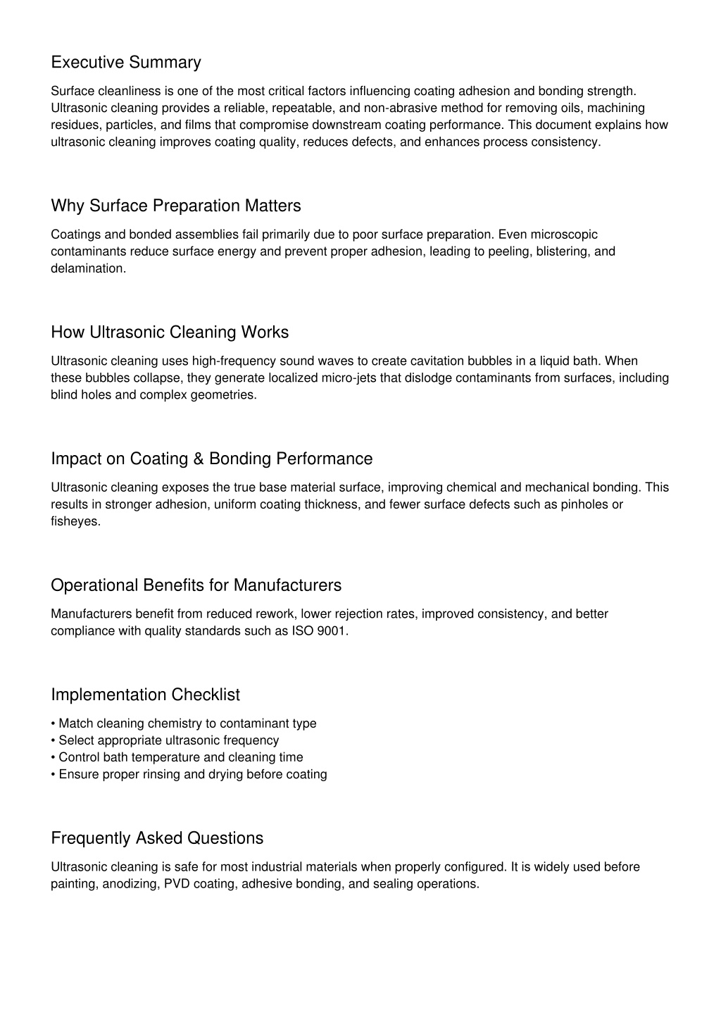 Executive Summary Surface cleanliness is one of the most critical factors influencing coating adhesion and bonding strength. Ultrasonic cleaning provides a reliable, repeatable, and non-abrasive method for removing oils, machining residues, particles, and films that compromise downstream coating performance. This document explains how ultrasonic cleaning improves coating quality, reduces defects, and enhances process consistency. Why Surface Preparation Matters Coatings and bonded assemblies fail primarily due to poor surface preparation. Even microscopic contaminants reduce surface energy and prevent proper adhesion, leading to peeling, blistering, and delamination. How Ultrasonic Cleaning Works Ultrasonic cleaning uses high-frequency sound waves to create cavitation bubbles in a liquid bath. When these bubbles collapse, they generate localized micro-jets that dislodge contaminants from surfaces, including blind holes and complex geometries. Impact on Coating & Bonding Performance Ultrasonic cleaning exposes the true base material surface, improving chemical and mechanical bonding. This results in stronger adhesion, uniform coating thickness, and fewer surface defects such as pinholes or fisheyes. Operational Benefits for Manufacturers Manufacturers benefit from reduced rework, lower rejection rates, improved consistency, and better compliance with quality standards such as ISO 9001. Implementation Checklist • Match cleaning chemistry to contaminant type • Select appropriate ultrasonic frequency • Control bath temperature and cleaning time • Ensure proper rinsing and drying before coating Frequently Asked Questions Ultrasonic cleaning is safe for most industrial materials when properly configured. It is widely used before painting, anodizing, PVD coating, adhesive bonding, and sealing operations.