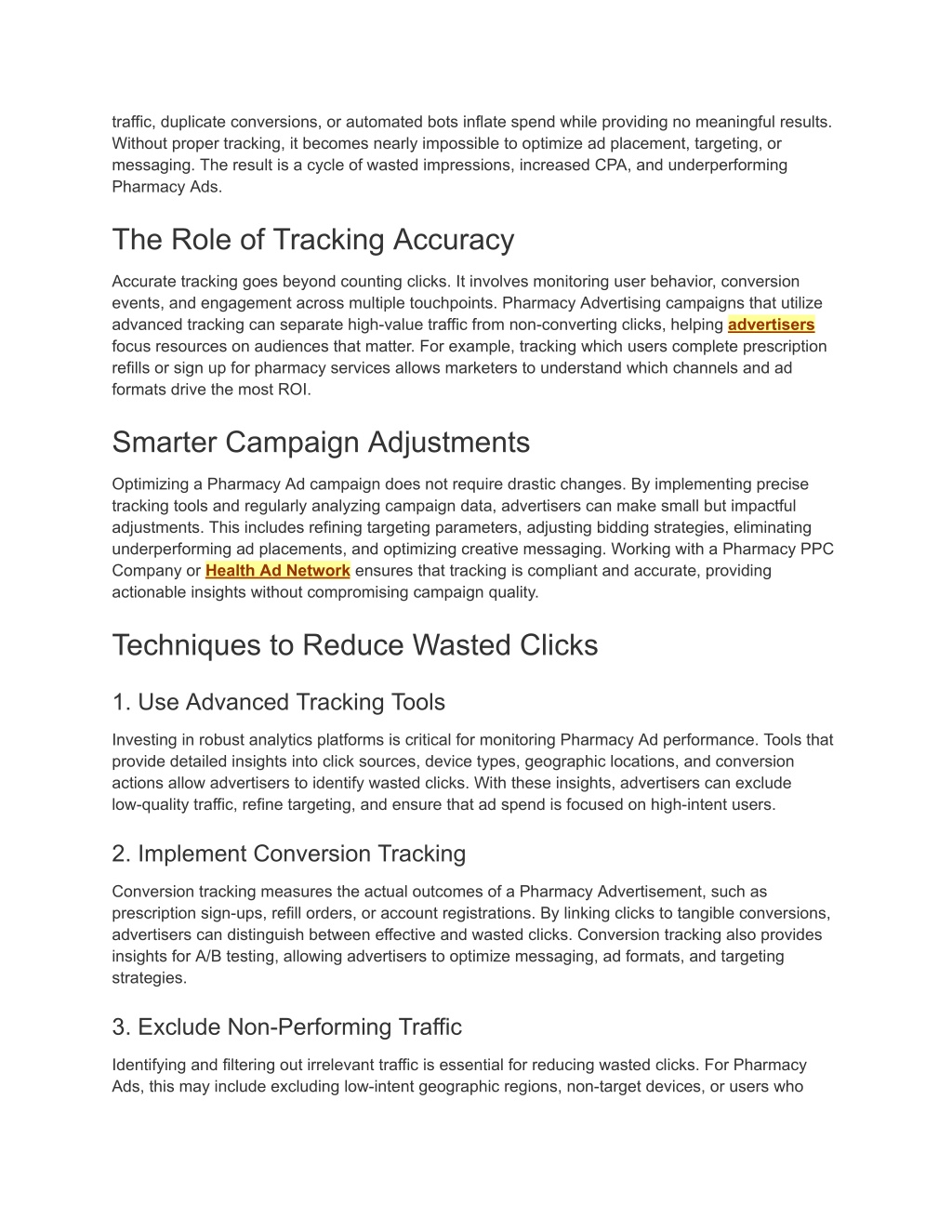 traffic, duplicate conversions, or automated bots inflate spend while providing no meaningful results. Without proper tracking, it becomes nearly impossible to optimize ad placement, targeting, or messaging. The result is a cycle of wasted impressions, increased CPA, and underperforming Pharmacy Ads. The Role of Tracking Accuracy Accurate tracking goes beyond counting clicks. It involves monitoring user behavior, conversion events, and engagement across multiple touchpoints. Pharmacy Advertising campaigns that utilize advanced tracking can separate high-value traffic from non-converting clicks, helping advertisers focus resources on audiences that matter. For example, tracking which users complete prescription refills or sign up for pharmacy services allows marketers to understand which channels and ad formats drive the most ROI. Smarter Campaign Adjustments Optimizing a Pharmacy Ad campaign does not require drastic changes. By implementing precise tracking tools and regularly analyzing campaign data, advertisers can make small but impactful adjustments. This includes refining targeting parameters, adjusting bidding strategies, eliminating underperforming ad placements, and optimizing creative messaging. Working with a Pharmacy PPC Company or Health Ad Network ensures that tracking is compliant and accurate, providing actionable insights without compromising campaign quality. Techniques to Reduce Wasted Clicks 1. Use Advanced Tracking Tools Investing in robust analytics platforms is critical for monitoring Pharmacy Ad performance. Tools that provide detailed insights into click sources, device types, geographic locations, and conversion actions allow advertisers to identify wasted clicks. With these insights, advertisers can exclude low-quality traffic, refine targeting, and ensure that ad spend is focused on high-intent users. 2. Implement Conversion Tracking Conversion tracking measures the actual outcomes of a Pharmacy Advertisement, such as prescription sign-ups, refill orders, or account registrations. By linking clicks to tangible conversions, advertisers can distinguish between effective and wasted clicks. Conversion tracking also provides insights for A/B testing, allowing advertisers to optimize messaging, ad formats, and targeting strategies. 3. Exclude Non-Performing Traffic Identifying and filtering out irrelevant traffic is essential for reducing wasted clicks. For Pharmacy Ads, this may include excluding low-intent geographic regions, non-target devices, or users who