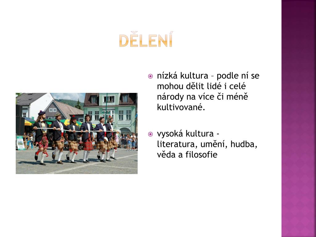 dělení • nízká kultura – podle ní se mohou dělit lidé i celé národy na více či méně kultivované. • vysoká kultura - literatura, umění, hudba, věda a filosofie