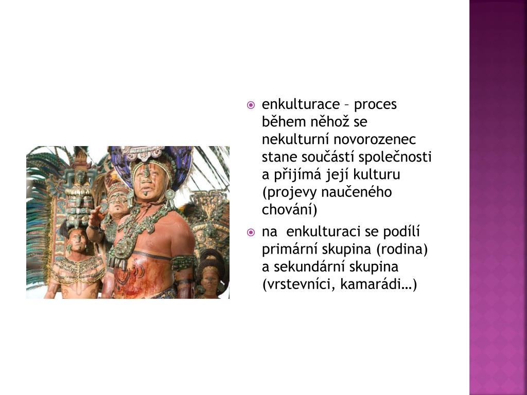 enkulturace – proces během něhož se nekulturní novorozenec stane součástí společnosti a přijímá její kulturu (projevy naučeného chování) • na enkulturaci se podílí primární skupina (rodina) a sekundární skupina (vrstevníci, kamarádi…)
