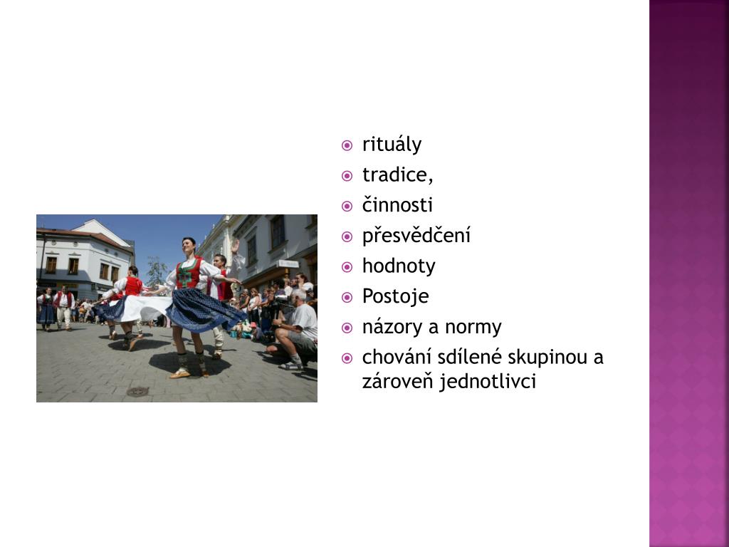 rituály • tradice, • činnosti • přesvědčení • hodnoty • Postoje • názory a normy • chování sdílené skupinou a zároveň jednotlivci
