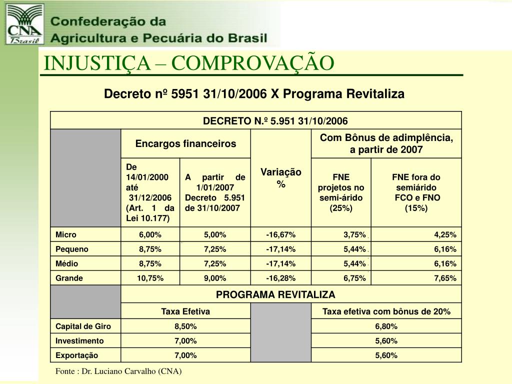 INJUSTIÇA – COMPROVAÇÃO Decreto nº 5951 31/10/2006 X Programa Revitaliza Fonte : Dr. Luciano Carvalho (CNA)