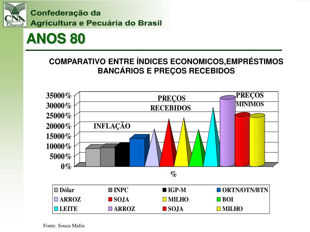 ANOS 80 COMPARATIVO ENTRE ÍNDICES ECONOMICOS,EMPRÉSTIMOS BANCÁRIOS E PREÇOS RECEBIDOS Fonte: Souza Mafra