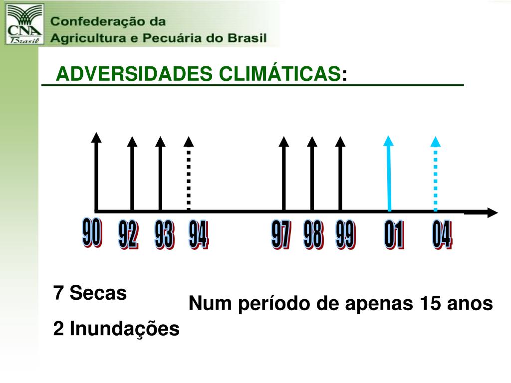 ADVERSIDADES CLIMÁTICAS: 90 92 93 94 97 98 99 01 04 7 Secas 2 Inundações Num período de apenas 15 anos