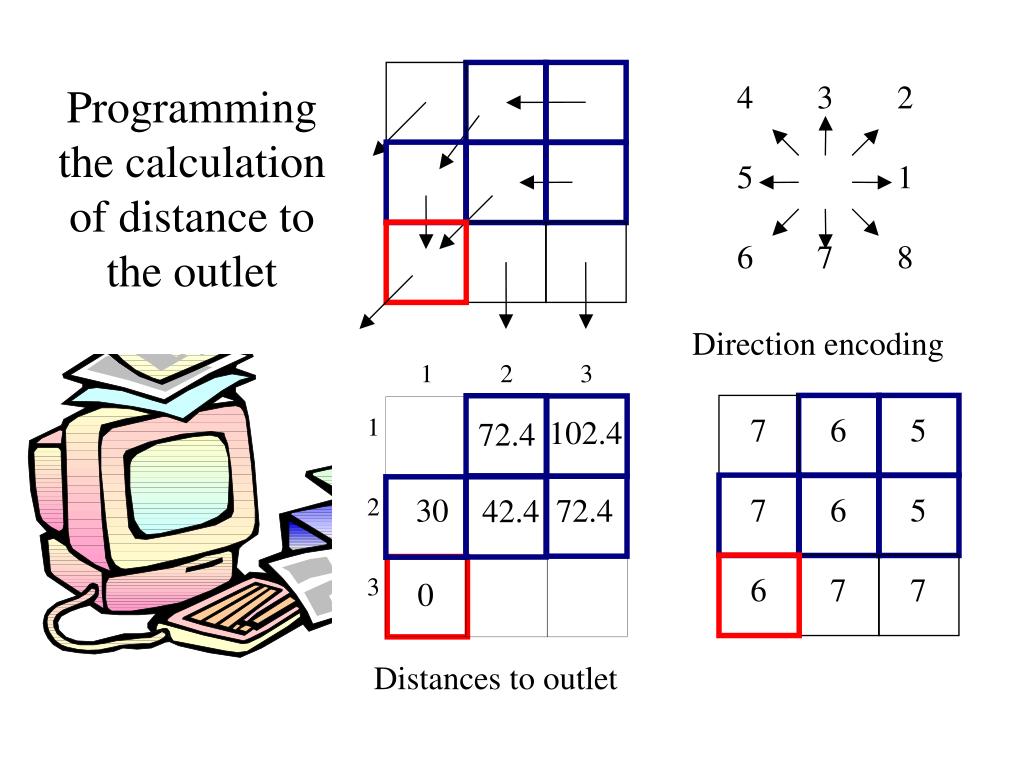 Steps for distance to outlet program • Read the outlet coordinates • Read the DEM flow direction grid. This is a set of integer values 1 to 8 indicating flow direction • Initialize a distance to outlet grid with a no data value • Convert outlet to row and column references • Start from the outlet point. Set the distance to 0. • Examine each neighboring grid cell and if it drains to the current cell set its distance to the outlet as the distance from it to the current cell plus the distance from the current cell to the outlet.