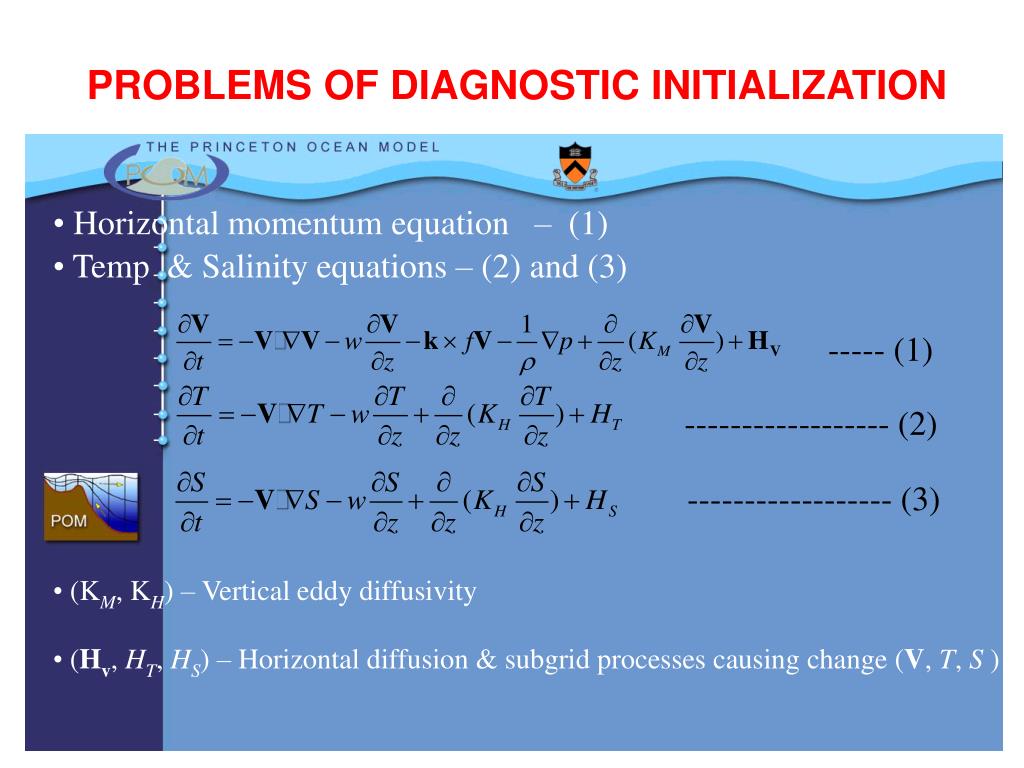 PROBLEMS OF DIAGNOSTIC INITIALIZATION • Horizontal momentum equation – (1) • Temp & Salinity equations – (2) and (3) ----- (1) ------------------ (2) ------------------ (3) • (KM, KH) – Vertical eddy diffusivity • (Hv, HT, HS) – Horizontal diffusion & subgrid processes causing change (V, T, S )