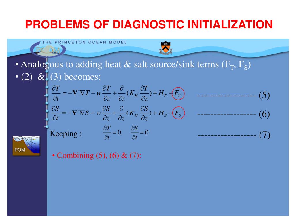 ------------------ (5) ------------------ (6) PROBLEMS OF DIAGNOSTIC INITIALIZATION • Analogous to adding heat & salt source/sink terms (FT, FS) • (2) & (3) becomes: Keeping : ------------------ (7) • Combining (5), (6) & (7):