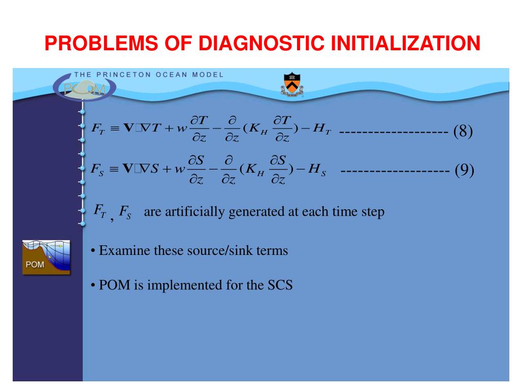 , PROBLEMS OF DIAGNOSTIC INITIALIZATION ------------------- (8) ------------------- (9) are artificially generated at each time step • Examine these source/sink terms • POM is implemented for the SCS