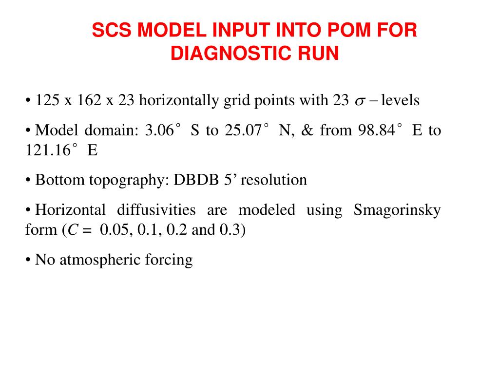 SCS MODEL INPUT INTO POM FOR DIAGNOSTIC RUN • Closed lateral boundaries • Free slip condition • Zero gradient condition for temp & salinity • No advective or diffusive heat, salt or velocity fluxes through boundaries • Open boundaries, radiative boundary condition with zero vol transport