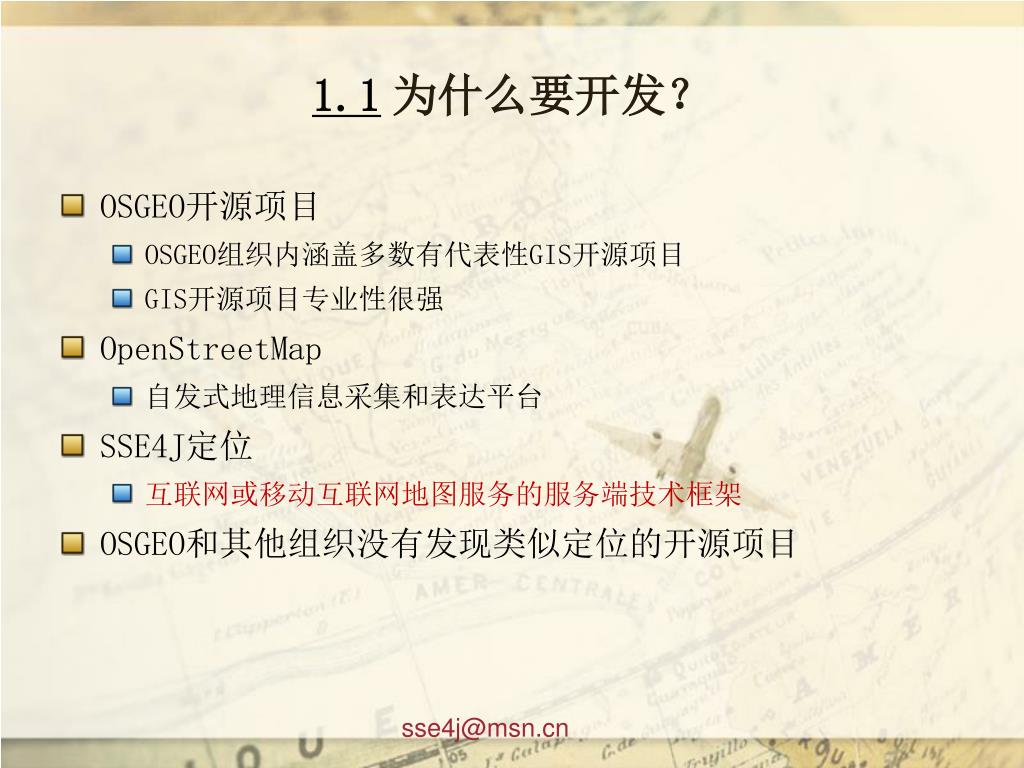 1.1为什么要开发? • OSGEO开源项目 • OSGEO组织内涵盖多数有代表性GIS开源项目 • GIS开源项目专业性很强 • OpenStreetMap • 自发式地理信息采集和表达平台 • SSE4J定位 • 互联网或移动互联网地图服务的服务端技术框架 • OSGEO和其他组织没有发现类似定位的开源项目