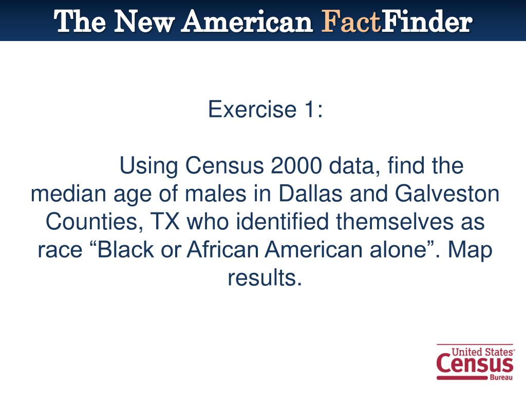 The New American FactFinder Exercise 1: Using Census 2000 data, find the median age of males in Dallas and Galveston Counties, TX who identified themselves as race “Black or African American alone”. Map results.