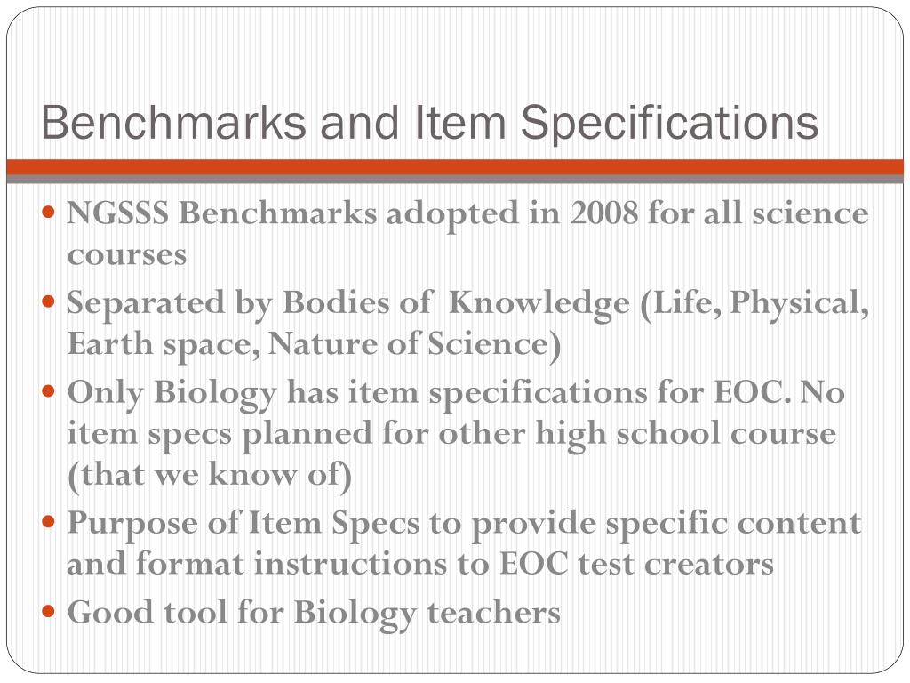 Benchmarks and Item Specifications • NGSSS Benchmarks adopted in 2008 for all science courses • Separated by Bodies of Knowledge (Life, Physical, Earth space, Nature of Science) • Only Biology has item specifications for EOC. No item specs planned for other high school course (that we know of) • Purpose of Item Specs to provide specific content and format instructions to EOC test creators • Good tool for Biology teachers