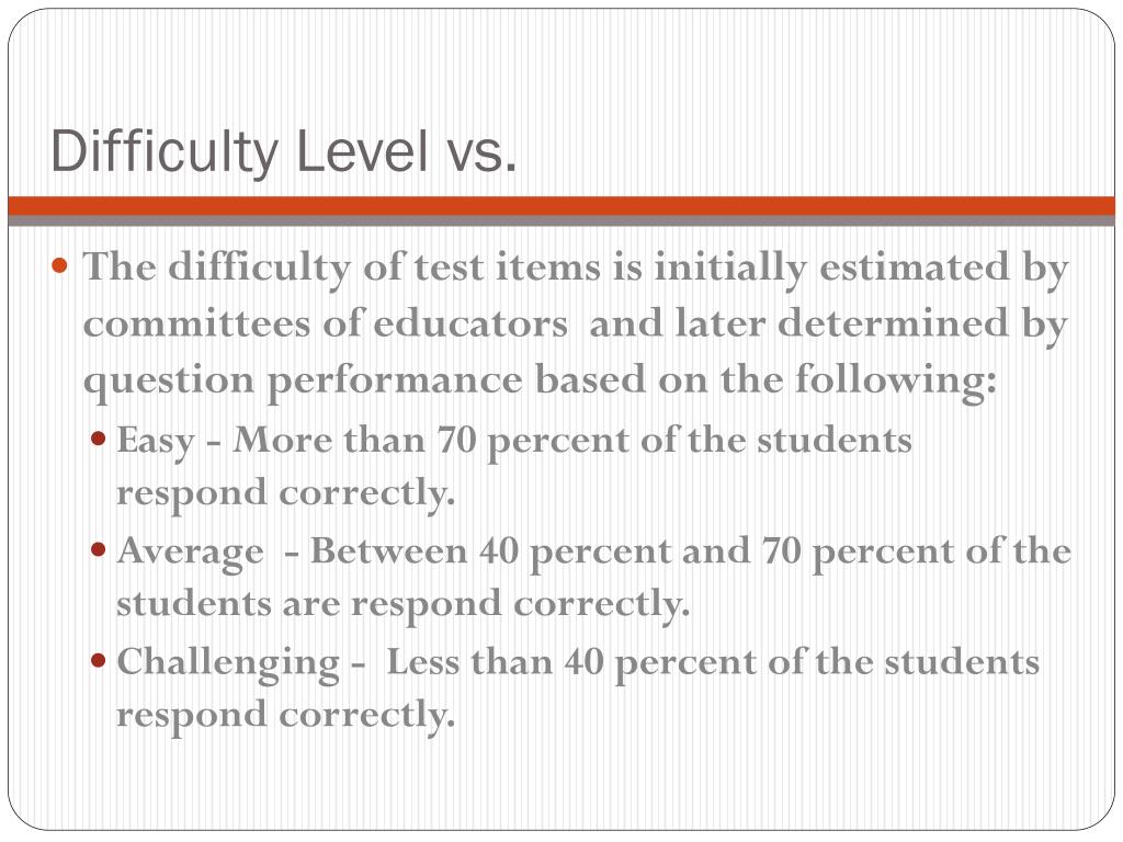 Difficulty Level vs. • The difficulty of test items is initially estimated by committees of educators and later determined by question performance based on the following: • Easy - More than 70 percent of the students respond correctly. • Average - Between 40 percent and 70 percent of the students are respond correctly. • Challenging - Less than 40 percent of the students respond correctly.