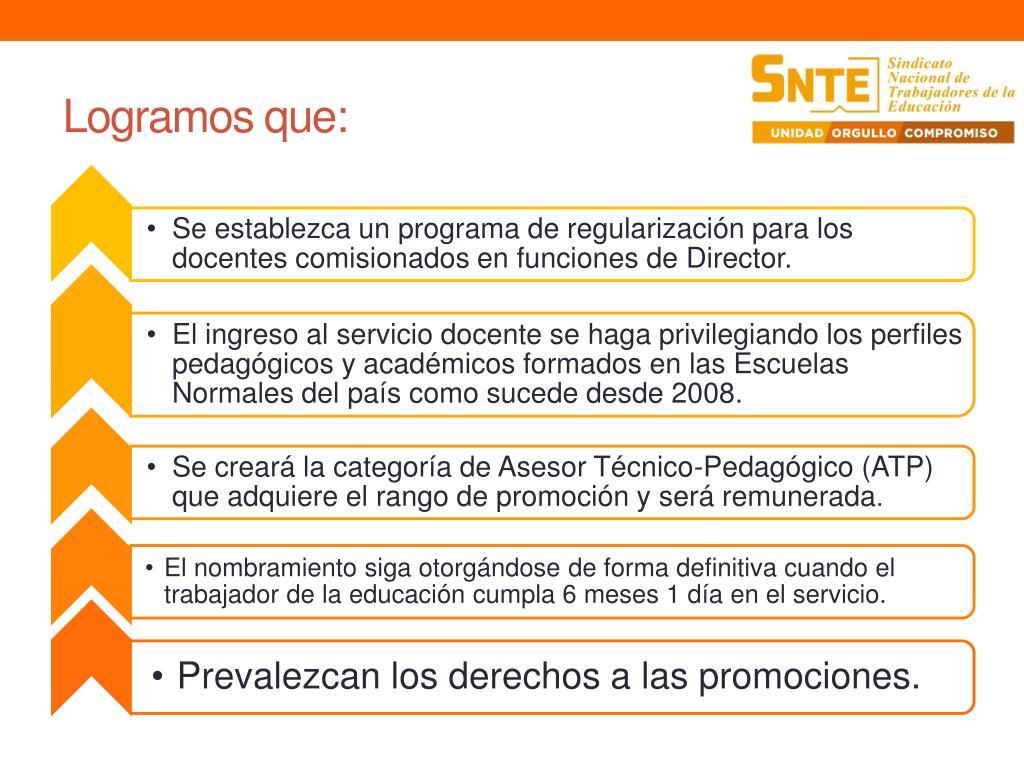 NUESTRA AGENDA • Curso-taller para los aspirantes a ingresar al servicio docente; • Participar en los procesos para el ingreso al servicio docente; • Convocatoria, registro, evaluación, publicación de resultados, asignación de nombramiento, adscripción; • Acompañamiento pedagógico durante los dos años de tutoría para acceder al nombramiento definitivo; • Inscripción de los docentes que obtengan su nombramiento indeterminado en el Sistema Sindical de Desarrollo Profesional.