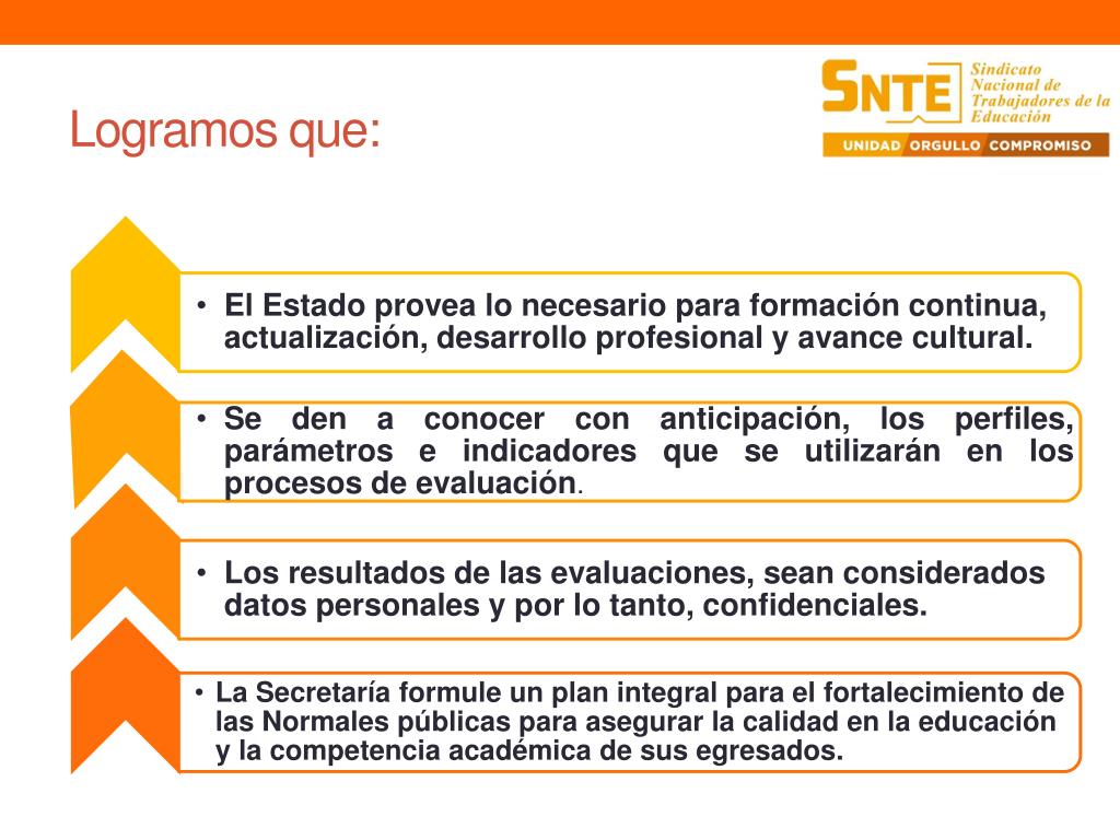 NUESTRA AGENDA • Revisar con las autoridades educativas locales los perfiles profesionales para cada nivel educativo y modalidad, para participar en su posible modificación. • Participar con las autoridades educativas locales en la construcción de los parámetros e indicadores complementarios de desempeño para docentes, directivos y supervisores, para el ingreso, promoción, permanencia y reconocimientos. • Establecer con la autoridad educativa el acuerdo de cómo serán los procesos para el ingreso, promoción, reconocimiento ( calendario, convocatorias, adscripciones...), transparentarlos para garantizar el respeto a los derechos de nuestros compañeros.