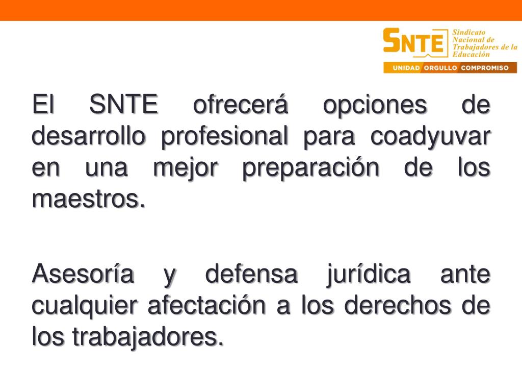 El SNTE ofrecerá opciones de desarrollo profesional para coadyuvar en una mejor preparación de los maestros. Asesoría y defensa jurídica ante cualquier afectación a los derechos de los trabajadores.