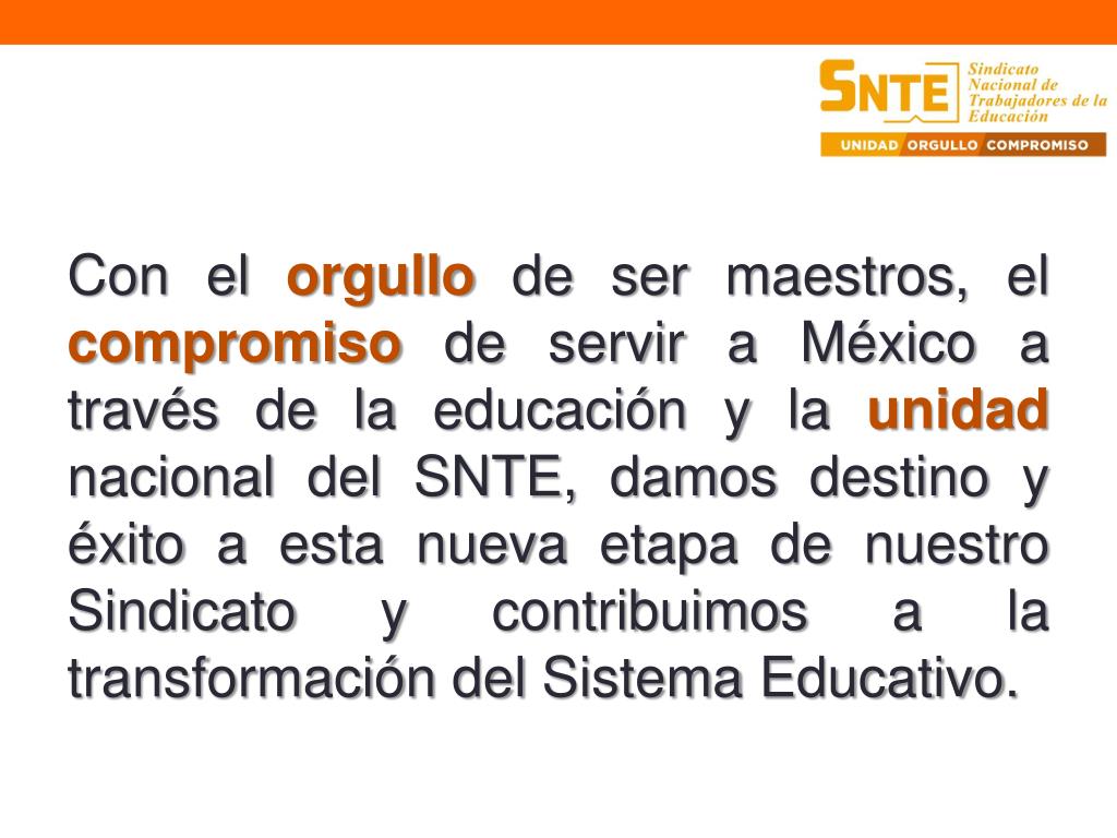 Con el orgullode ser maestros, el compromiso de servir a México a través de la educación y la unidadnacional del SNTE, damos destino y éxito a esta nueva etapa de nuestro Sindicato y contribuimos a la transformación del Sistema Educativo.
