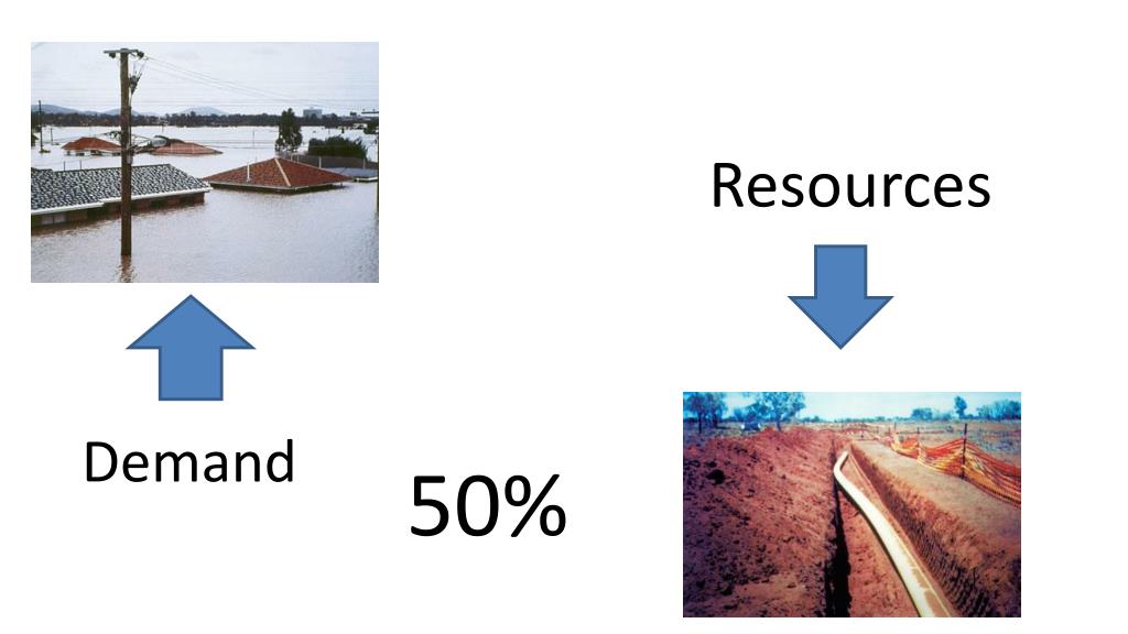 Disasters and Crisis: Dilemmas and Challenges for Boards. Michael Tarrant. Disasters. Resources. Demand. 50%. The Evolution of Australian Emergency Management Theory and Practice . Concepts. Time frame. Post WW2. 1970s. 1980s. 1990s. 2000s. Future. War (Civil Defence).