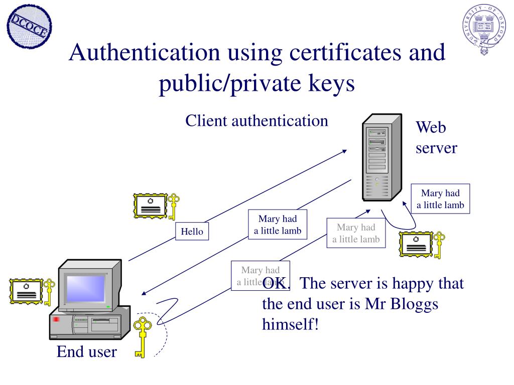 Client authentication Mary had a little lamb Mary had a little lamb Hello Mary had a little lamb End user Authentication using certificates and public/private keys Webserver Mary had a little lamb OK. The server is happy that the end user is Mr Bloggs himself!