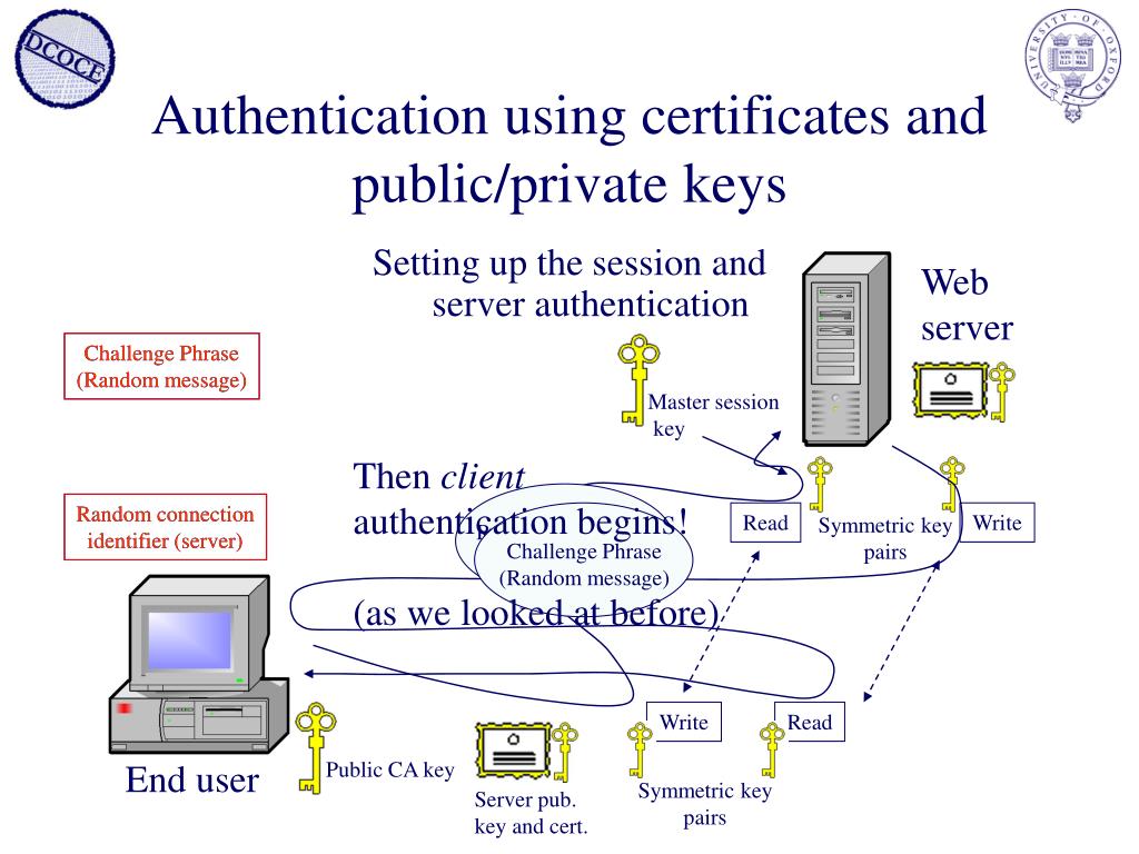 Setting up the session and server authentication Symmetric key pairs (Encrypted) End user Master session key Public CA key Server pub. key and cert. Authentication using certificates and public/private keys Webserver Challenge Phrase (Random message) Random connection identifier (server)
