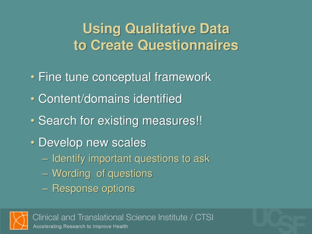 Using Qualitative Data to Create Questionnaires • Fine tune conceptual framework • Content/domains identified • Search for existing measures!! • Develop new scales • Identify important questions to ask • Wording of questions • Response options