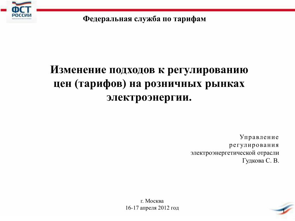 Федеральная служба по тарифам Изменение подходов к регулированию цен (тарифов) на розничных рынках электроэнергии. Управление регулирования электроэнергетической отрасли Гудкова С. В. г. Москва 16-17 апреля 2012 год