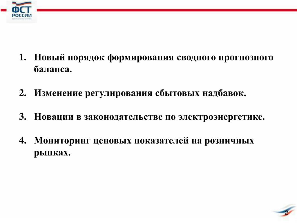 Новый порядок формирования сводного прогнозного баланса. • Изменение регулирования сбытовых надбавок. • Новации в законодательстве по электроэнергетике. • Мониторинг ценовых показателей на розничных рынках.