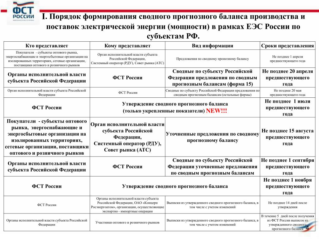Ι. Порядок формирования сводного прогнозного баланса производства и поставок электрической энергии (мощности) в рамках ЕЭС России по субъектам РФ.
