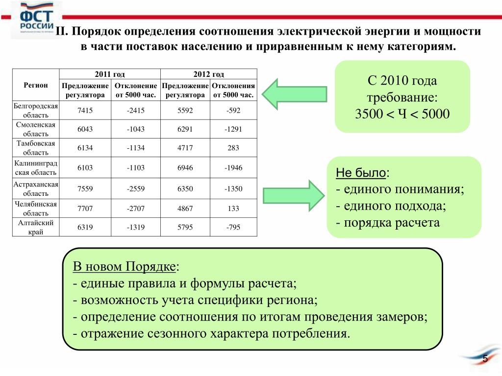 ΙΙ. Порядок определения соотношения электрической энергии и мощности в части поставок населению и приравненным к нему категориям. С 2010 года требование: 3500 < Ч < 5000 • Не было: • единого понимания; • единого подхода; • порядка расчета • В новом Порядке: • единые правила и формулы расчета; • возможность учета специфики региона; • определение соотношения по итогам проведения замеров; • отражение сезонного характера потребления.