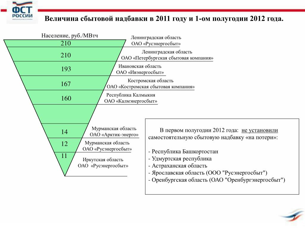 Величина сбытовой надбавки в 2011 году и 1-ом полугодии 2012 года. 210 Ленинградская область ОАО «Русэнергосбыт» Население, руб./МВтч 210 Ленинградская область ОАО «Петербургская сбытовая компания» 193 Ивановская область ОАО «Ивэнергосбыт» 167 Костромская область ОАО «Костромская сбытовая компания» 160 Республика Калмыкия ОАО «Калмэнергосбыт» 14 Мурманская область ОАО «Арктик-энерго» В первом полугодии 2012 года: не установили самостоятельную сбытовую надбавку «на потери»: - Республика Башкортостан - Удмуртская республика - Астраханская область - Ярославская область (ООО "Русэнергосбыт") - Оренбургская область (ОАО "Оренбургэнергосбыт") 12 Мурманская область ОАО «Русэнергосбыт» 11 Иркутская область ОАО «Русэнергосбыт»