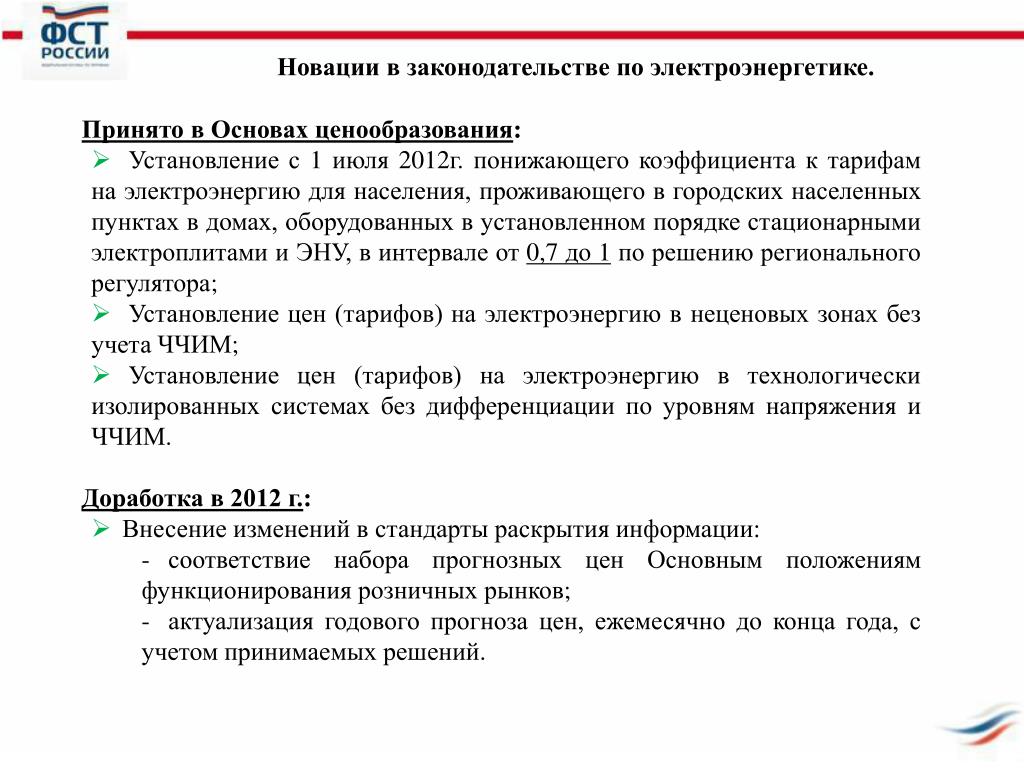 Новации в законодательстве по электроэнергетике. • Принято в Основах ценообразования: • Установление с 1 июля 2012г. понижающего коэффициента к тарифам на электроэнергию для населения, проживающего в городских населенных пунктах в домах, оборудованных в установленном порядке стационарными электроплитами и ЭНУ, в интервале от 0,7 до 1 по решению регионального регулятора; • Установление цен (тарифов) на электроэнергию в неценовых зонах без учета ЧЧИМ; • Установление цен (тарифов) на электроэнергию в технологически изолированных системах без дифференциации по уровням напряжения и ЧЧИМ. • Доработка в 2012 г.: • Внесение изменений в стандарты раскрытия информации: • соответствие набора прогнозных цен Основным положениям функционирования розничных рынков; • актуализация годового прогноза цен, ежемесячно до конца года, с учетом принимаемых решений.