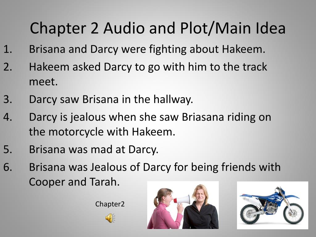 Chapter 2 Audio and Plot/Main Idea • Brisana and Darcy were fighting about Hakeem. • Hakeem asked Darcy to go with him to the track meet. • Darcy saw Brisana in the hallway. • Darcy is jealous when she saw Briasana riding on the motorcycle with Hakeem. • Brisana was mad at Darcy. • Brisana was Jealous of Darcy for being friends with Cooper and Tarah. Chapter2