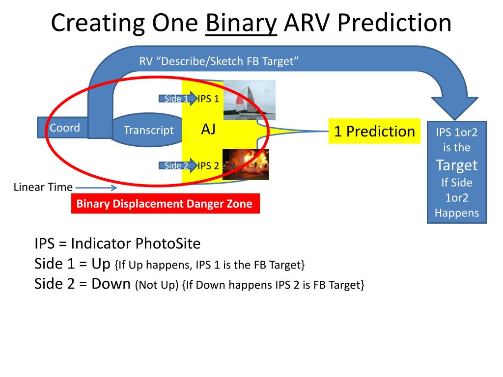 Creating One Binary ARV Prediction RV “Describe/Sketch FB Target” Side 1 Transcript Coord IPS 1or2 is the Target If Side 1or2 Happens IPS 1 AJ IPS 2 Side 2 1 Prediction Linear Time Binary Displacement Danger Zone IPS = Indicator PhotoSite Side 1 = Up {If Up happens, IPS 1 is the FB Target} Side 2 = Down (Not Up) {If Down happens IPS 2 is FB Target}