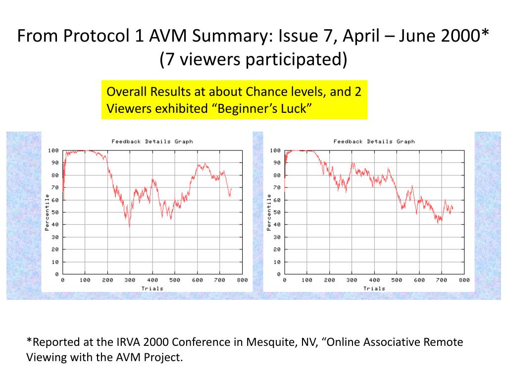 From Protocol 1 AVM Summary: Issue 7, April – June 2000*(7 viewers participated) Overall Results at about Chance levels, and 2 Viewers exhibited “Beginner’s Luck” *Reported at the IRVA 2000 Conference in Mesquite, NV, “Online Associative Remote Viewing with the AVM Project.
