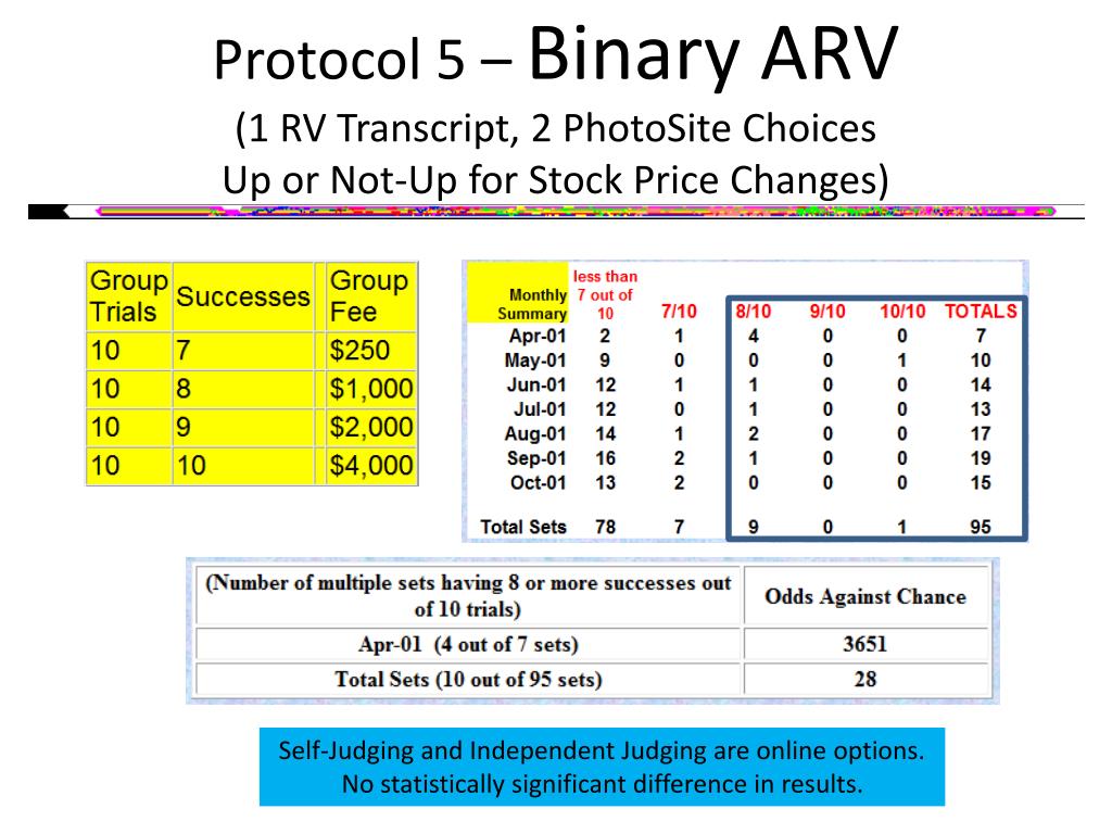 Protocol 5 – Binary ARV(1 RV Transcript, 2 PhotoSite ChoicesUp or Not-Up for Stock Price Changes) Self-Judging and Independent Judging are online options. No statistically significant difference in results.