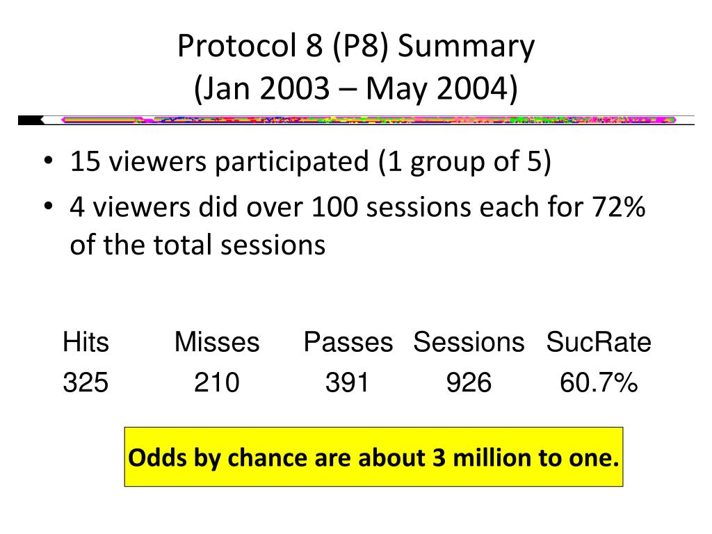 Protocol 8 (P8) Summary(Jan 2003 – May 2004) • 15 viewers participated (1 group of 5) • 4 viewers did over 100 sessions each for 72% of the total sessions Odds by chance are about 3 million to one.