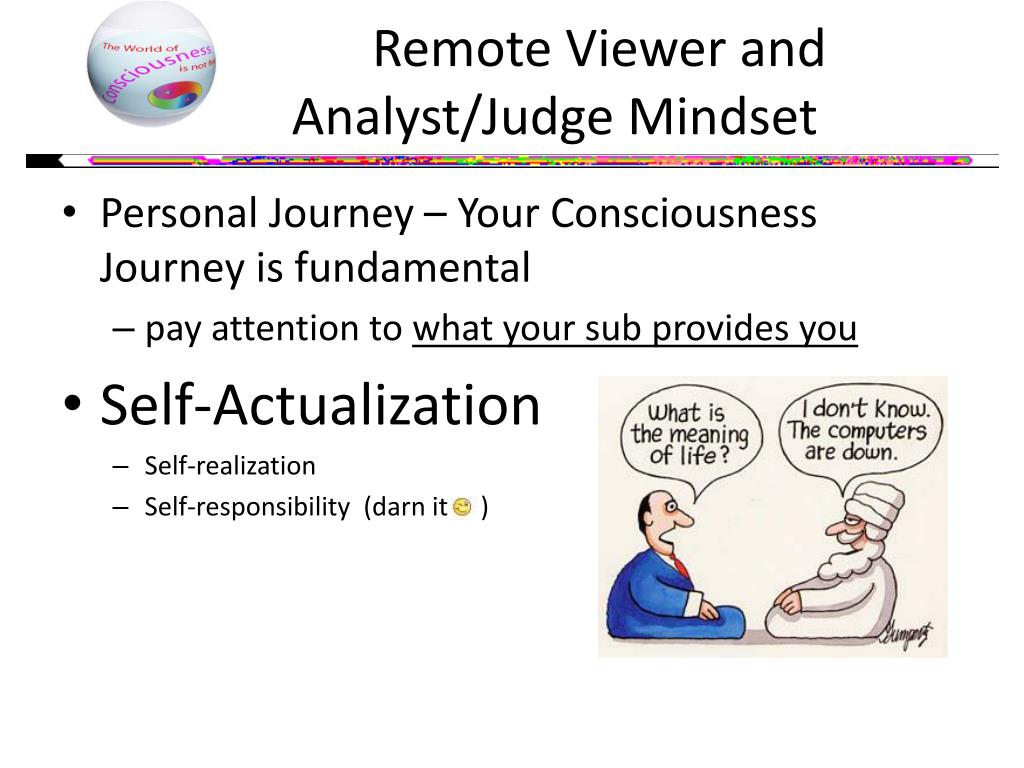 Remote Viewer and Analyst/Judge Mindset • Personal Journey – Your Consciousness Journey is fundamental • pay attention to what your sub provides you • Self-Actualization • Self-realization • Self-responsibility (darn it )