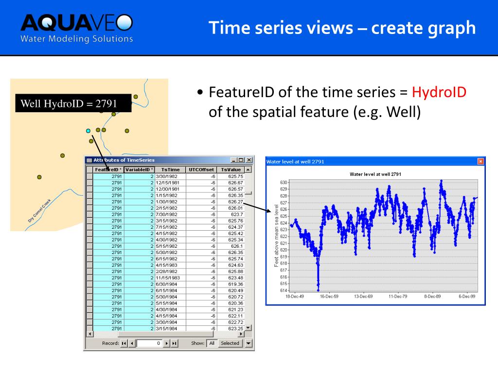 Time series views – create graph • FeatureID of the time series = HydroID of the spatial feature (e.g. Well) Well HydroID = 2791