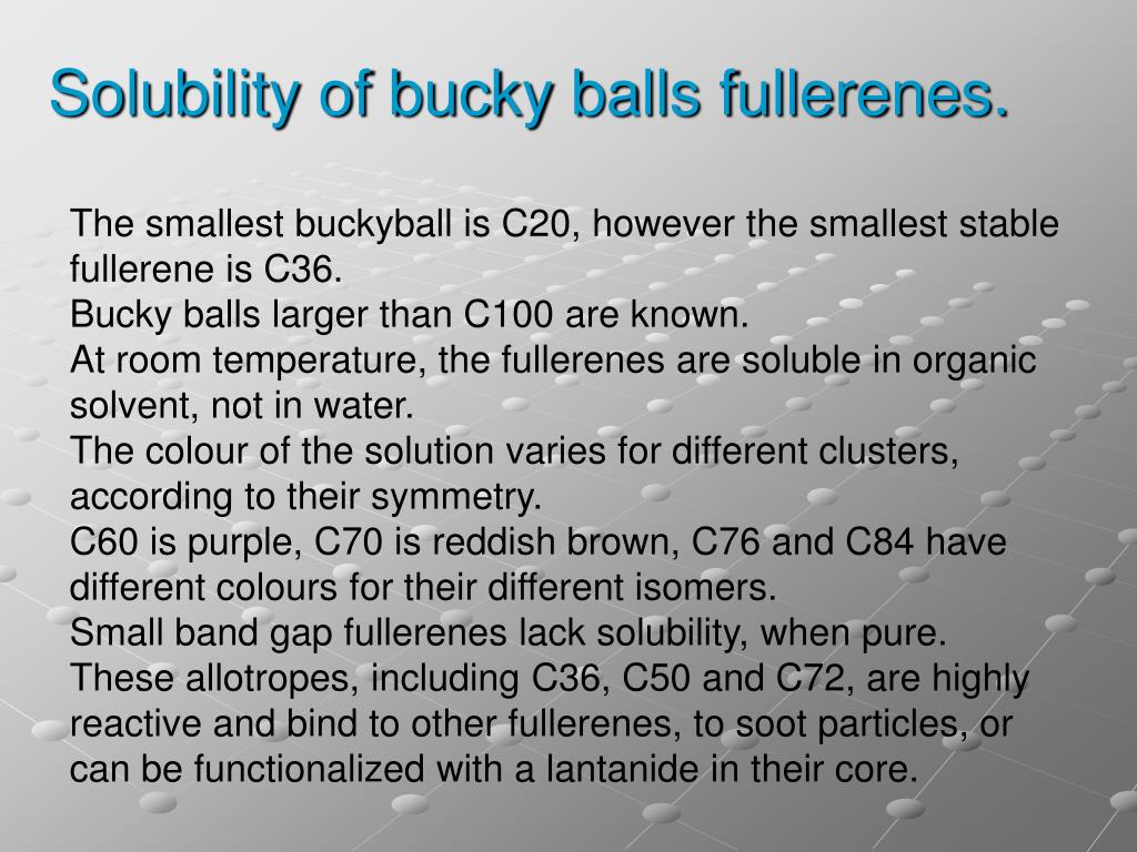 Solubility of bucky balls fullerenes. The smallest buckyball is C20, however the smallest stable fullerene is C36. Bucky balls larger than C100 are known. At room temperature, the fullerenes are soluble in organic solvent, not in water. The colour of the solution varies for different clusters, according to their symmetry. C60 is purple, C70 is reddish brown, C76 and C84 have different colours for their different isomers. Small band gap fullerenes lack solubility, when pure. These allotropes, including C36, C50 and C72, are highly reactive and bind to other fullerenes, to soot particles, or can be functionalized with a lantanide in their core.