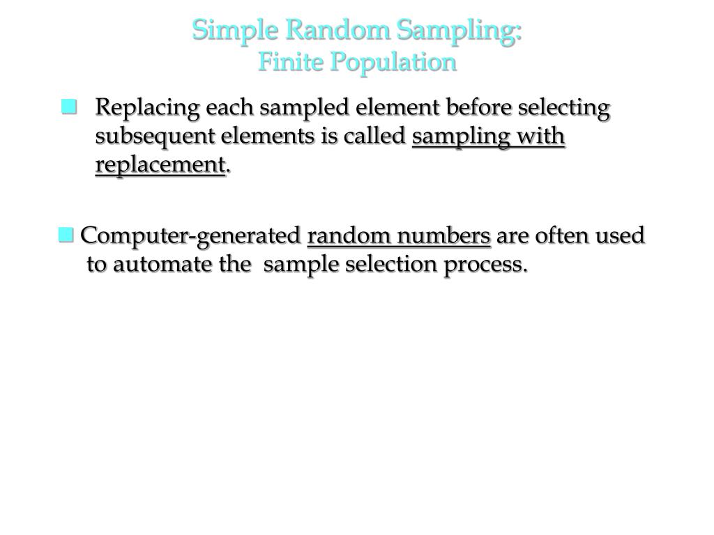 Simple Random Sampling:Finite Population • Replacing each sampled element before selecting • subsequent elements is called sampling with • replacement. • Computer-generated random numbers are often used to automate the sample selection process.