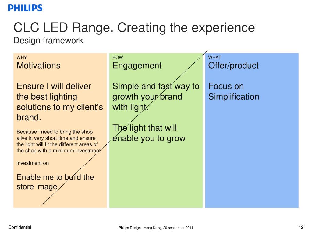 CLC LED Range. Creating the experienceDesign framework WHY Motivations Ensure I will deliver the best lighting solutions to my client’s brand. Because I need to bring the shop alive in very short time and ensure the light will fit the different areas of the shop with a minimum investment investment on Enable me to build the store image HOW Engagement Simple and fast way to growth your brand with light. The light that will enable you to grow WHAT Offer/product Focus on Simplification