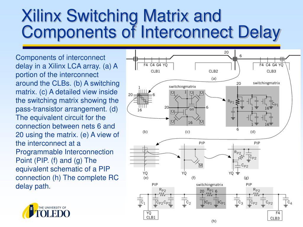 Xilinx Switching Matrix and Components of Interconnect Delay Components of interconnect delay in a Xilinx LCA array. (a) A portion of the interconnect around the CLBs. (b) A switching matrix. (c) A detailed view inside the switching matrix showing the pass-transistor arrangement. (d) The equivalent circuit for the connection between nets 6 and 20 using the matrix. (e) A view of the interconnect at a Programmable Interconnection Point (PIP. (f) and (g) The equivalent schematic of a PIP connection (h) The complete RC delay path.