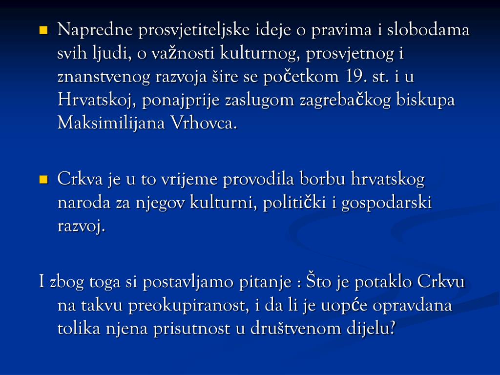 Napredne prosvjetiteljske ideje o pravima i slobodama svih ljudi, o važnosti kulturnog, prosvjetnog i znanstvenog razvoja šire se početkom 19. st. i u Hrvatskoj, ponajprije zaslugom zagrebačkog biskupa Maksimilijana Vrhovca. • Crkva je u to vrijeme provodila borbu hrvatskog naroda za njegov kulturni, politički i gospodarski razvoj. I zbog toga si postavljamo pitanje : Što je potaklo Crkvu na takvu preokupiranost, i da li je uopće opravdana tolika njena prisutnost u društvenom dijelu?