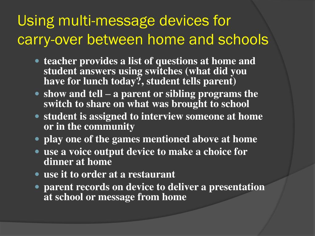 Using multi-message devices for carry-over between home and schools • teacher provides a list of questions at home and student answers using switches (what did you have for lunch today?, student tells parent) • show and tell – a parent or sibling programs the switch to share on what was brought to school • student is assigned to interview someone at home or in the community • play one of the games mentioned above at home • use a voice output device to make a choice for dinner at home • use it to order at a restaurant • parent records on device to deliver a presentation at school or message from home