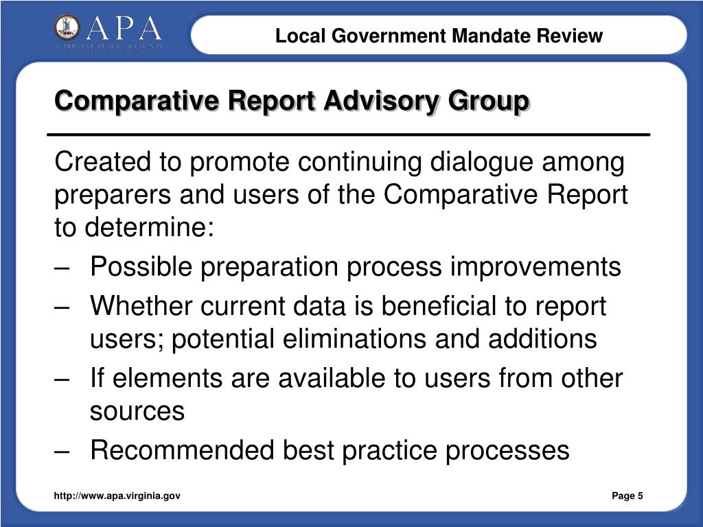 Comparative Report Advisory Group Created to promote continuing dialogue among preparers and users of the Comparative Report to determine: • Possible preparation process improvements • Whether current data is beneficial to report users; potential eliminations and additions • If elements are available to users from other sources • Recommended best practice processes http://www.apa.virginia.gov