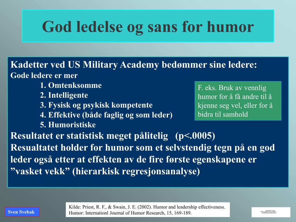 God ledelse og sans for humor Kadetter ved US Military Academy bedømmer sine ledere: Gode ledere er mer 1. Omtenksomme 2. Intelligente 3. Fysisk og psykisk kompetente 4. Effektive (både faglig og som leder) 5. Humoristiske Resultatet er statistisk meget pålitelig (p<.0005) Resualtatet holder for humor som et selvstendig tegn på en god leder også etter at effekten av de fire første egenskapene er ”vasket vekk” (hierarkisk regresjonsanalyse) F. eks. Bruk av vennlig humor for å få andre til å kjenne seg vel, eller for å bidra til samhold Kilde: Priest, R. F., & Swain, J. E. (2002). Humor and leadership effectiveness. Humor: Internationl Journal of Humor Research, 15, 169-189. Sven Svebak