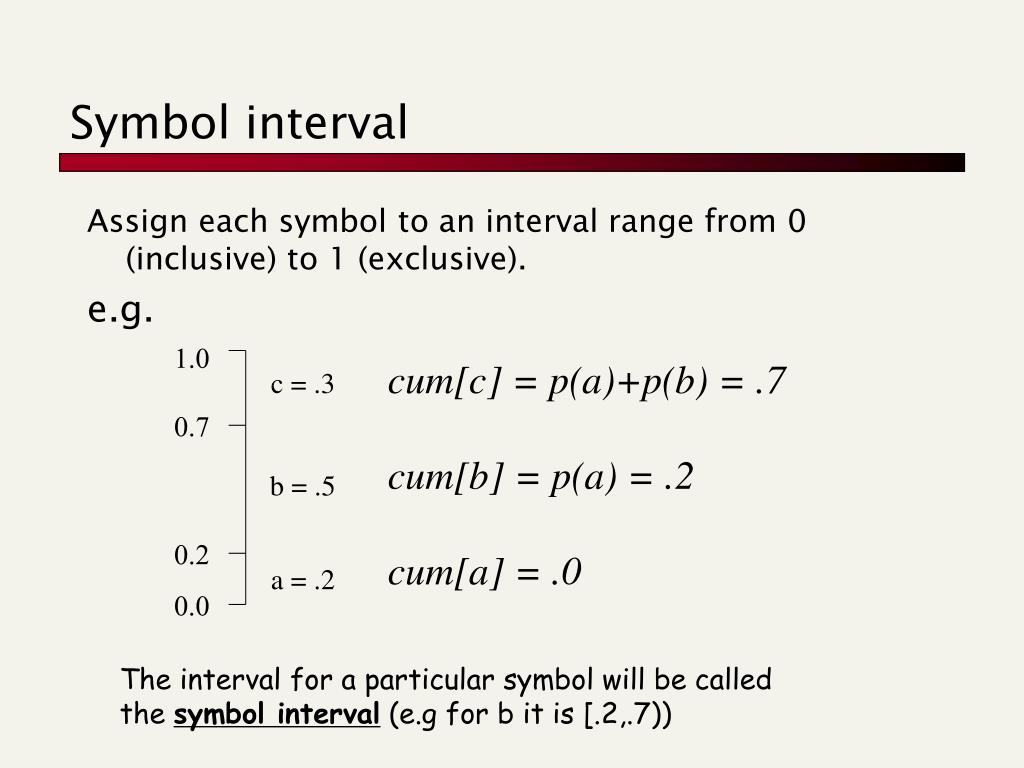 Symbol interval Assign each symbol to an interval range from 0 (inclusive) to 1 (exclusive). e.g. 1.0 cum[c] = p(a)+p(b) = .7 cum[b] = p(a) = .2 cum[a] = .0 c = .3 0.7 b = .5 0.2 a = .2 0.0 The interval for a particular symbol will be calledthe symbol interval (e.g for b it is [.2,.7))