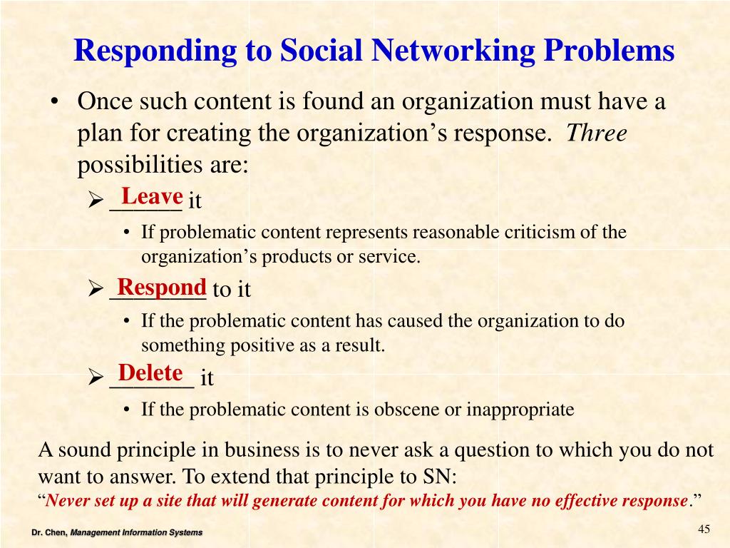 Responding to Social Networking Problems • Once such content is found an organization must have a plan for creating the organization’s response. Three possibilities are: • ______ it • If problematic content represents reasonable criticism of the organization’s products or service. • ________ to it • If the problematic content has caused the organization to do something positive as a result. • _______ it • If the problematic content is obscene or inappropriate Leave Respond Delete A sound principle in business is to never ask a question to which you do not want to answer. To extend that principle to SN: “Never set up a site that will generate content for which you have no effective response.”
