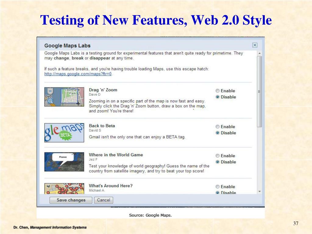 In the Web 2.0 World • No traditional marketing viral marketing • Value of site increases with users and use • Organic user interface and mashups(e.g., Google My Maps) – an output from two or more Web sites is combined into a single user experience). • Participation and ownership differences • Traditional Web sites are about publishing • Web 2.0 is about participation • Traditional Web site lock down all legal rights to content • Web 2.0 sites lock down only some rights